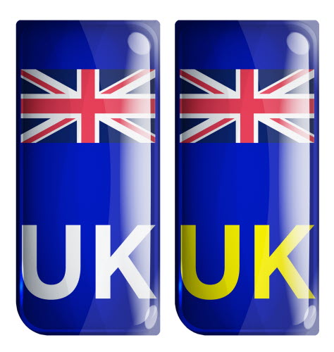 45mm x 90mm UK Car Registration Number Plate Rectangle Resin Dome Stickers - Printed Full Colour on a strong self adhesive vinyl with Union Jack Design and White / Yellow 'UK' Symbol. Supplied as pairs for applying to front and rear vehicle number plates.
